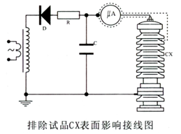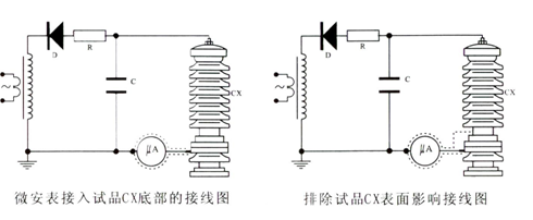 微安表必須有金屬屏蔽,應(yīng)采用屏蔽與被試品聯(lián)接。高壓引線的屏蔽引出應(yīng)與儀表端的屏蔽緊密聯(lián)接。如果被試品的表現(xiàn)污穢要排除被試品表面泄漏電流的影響可在被試品高電位端用裸體金屬軟線緊密繞幾圈后與高壓引線的屏蔽相聯(lián)接(見(jiàn)下圖)。