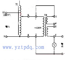 若按本圖所示,用一臺交流接觸式調(diào)壓器T1和一只初級220V,次級為雙30V的電源變壓器T2(要求T2功率大于用電器具的功率)串聯(lián)使用,則可實(shí)現(xiàn)輸出電壓比輸入電壓提高90V。