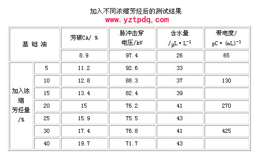 (4) 在表2可知,油的帶電度隨加入芳烴的含量增加而升高,這與油的結構族變化有關。另外,將基礎油和加入濃縮芳烴后滿足析氣性要求的“超高壓油”分別在125℃的烘箱中氧化13 h后,測得基礎油的帶電度增加約250 pC/mL,而“超高壓油”增加約500 pC/mL。這與抗氧化性能變差的結果相一致。