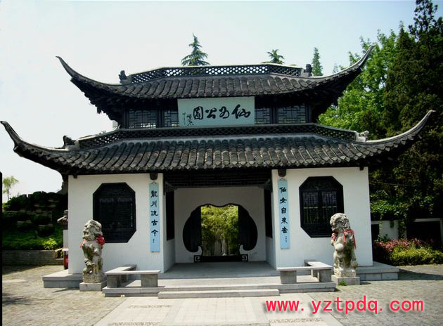 仙女公園門前設(shè)石牌坊,渾厚古樸,以淺紅色剁斧石建成,四柱皆取華表形制,云紋纏繞。正面坊額“龍川勝跡”,背面“仙女遺蹤”,雄奇雅健,筆力古樸。這8個字既將江都這一龍川勝地、仙女舊蹤點明,讓人發(fā)思古之幽情,又將“龍”、“仙”二字巧嵌4字之首,自然想起“山不在高,有仙則名;水不在深,有龍則靈”的名句。