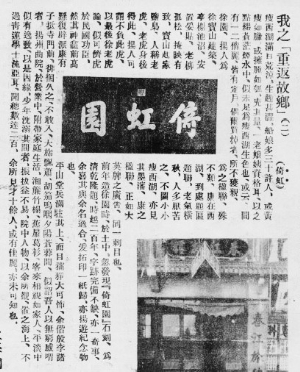 上世紀(jì)二十年代,素有“副刊圣手”之稱的老報(bào)人張慧劍游揚(yáng)州,也寫了一篇散文“揚(yáng)州游記”,收錄于上海世界書局1929年6月出版的《湖山味》,文中提到:“揚(yáng)州人因?yàn)檫@是蓋了紀(jì)念徐寶山的,因人及園,徐園遂也成為一個(gè)名勝了。當(dāng)我踏到徐園的盡頭處,看見(jiàn)墻上嵌有一塊碑石,大書曰:倚虹園。我有一個(gè)死掉的朋友畢倚虹,我又有一個(gè)常去吃飯的所在倚虹樓,我還有一個(gè)最歡喜聽(tīng)她唱白盔白甲白旗號(hào)的歌女倚虹閣;倚虹園三字便合我如同他鄉(xiāng)遇故知一般,毫不客氣地鉆進(jìn)我記憶里。”