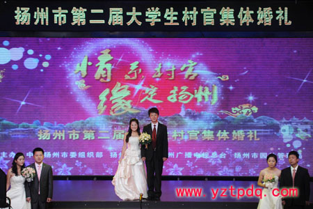 2011年10月18日,由揚(yáng)州市委組織部、市婦聯(lián)、市廣電總臺(tái)、市園林管理局等單位聯(lián)合主辦的揚(yáng)州市第二屆大學(xué)生村官集體婚禮在廣電中心演播廳隆重舉行,15對(duì)大學(xué)生村官“情系村官、緣定揚(yáng)州”集體成親。市委常委、組織部部長(zhǎng)丁純親臨現(xiàn)場(chǎng),為大學(xué)生村官新人證婚。