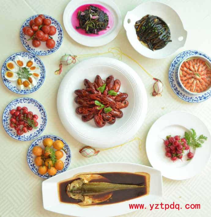 每到端午節(jié)的這一天,揚州人家中午一定要回家“嘗午”。所謂“嘗午”就是吃十二紅,是揚州人過端午節(jié)特有的習(xí)俗。“十二紅”是指十二樣自然紅色,或經(jīng)烹調(diào)后顏色發(fā)紅的時令菜肴,通常有咸鴨蛋、煮黃魚、粉皮拌黃瓜、炒蝦子、炒紅莧菜、燒仔鵝、洋花蘿卜、櫻桃、枇杷、紅杏、干菜燒肉、炒長魚、紅燒扒蹄、火腿、香腸、雄黃酒等。一般分為4碗8碟,即4個涼拌,4個熱炒,4個燒菜。這個數(shù)字代表每年的十二個月,再者它也兼顧了每年的四時八節(jié)。