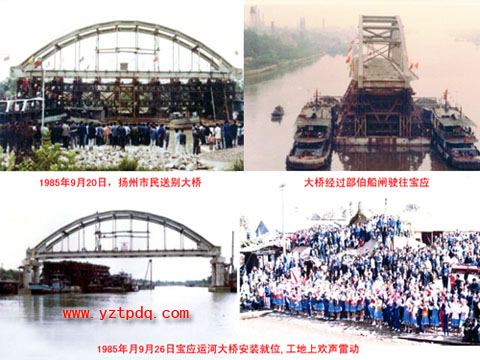 在揚(yáng)州水利局檔案室內(nèi),記者看到一份檔案寫著這樣的文字:20世紀(jì)50年代后期,揚(yáng)州大運(yùn)河改道由灣頭瓦窯鋪至六圩入江,為方便運(yùn)河兩岸交通往來(lái),1960年6月建成揚(yáng)州京杭運(yùn)河大橋。橋?qū)?2米,行車道寬7米,長(zhǎng)194米,計(jì)有7個(gè)孔,中間為通航孔,凈跨50米,系鋼筋混凝土系桿拱,其余6孔為長(zhǎng)20米的“T”型梁,是當(dāng)時(shí)揚(yáng)州區(qū)境內(nèi)規(guī)模最大、技術(shù)標(biāo)準(zhǔn)最高的公路橋。1985年9月在原橋南側(cè)新建的運(yùn)河大橋,與改造后的老橋合并為一體,原來(lái)大橋的系桿拱成了“廢物”,寶應(yīng)正打算建大橋,于是決定整體搬到寶應(yīng)。